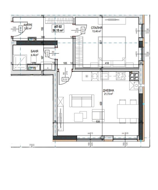 Апартаментът е с обща площ 67.52 кв.м и чиста жилищна площ 58.15 кв.м, като към него има и мазе с площ 4.59 кв.м.