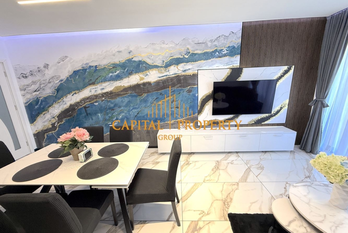 Без необходимост от каквито и да е ремонтни дейности, изцяло обзаведен, 3 климатика, 3 телевизора, оборудвана кухня /хладилник, фурна с котлони, аспиратор, пералня, микровълнова/, скрито осветление. Изложение - северозапад/югоизток. Към апартамента може да бъде закупено и паркомясто на цена от 25000 евро.